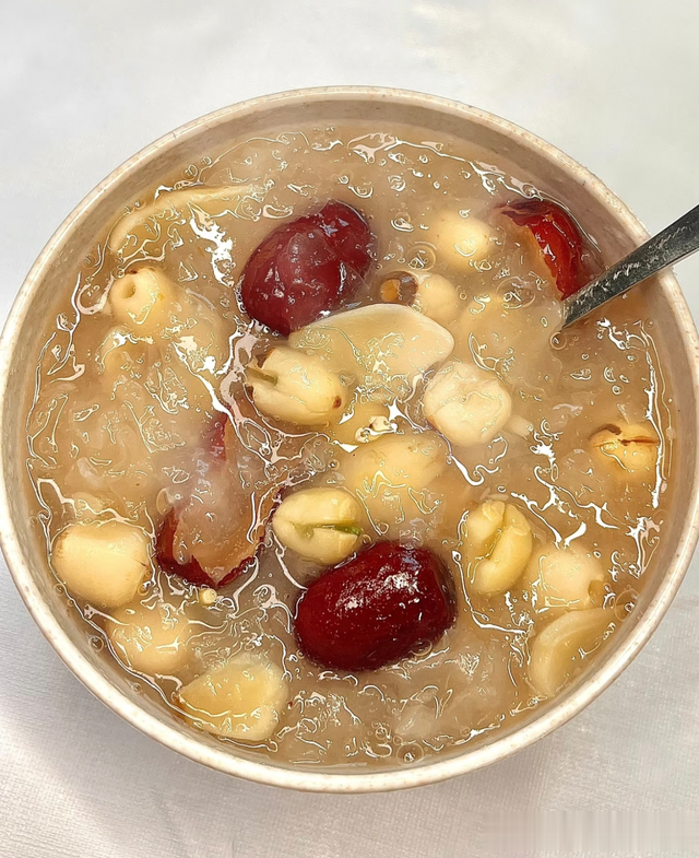 做法:先将银耳泡发撕成小朵,莲子和百合泡软,红枣去核切片。然后把所有食材放入炖盅,加适量清水,隔水炖40分钟,出锅前加冰糖融化即可。