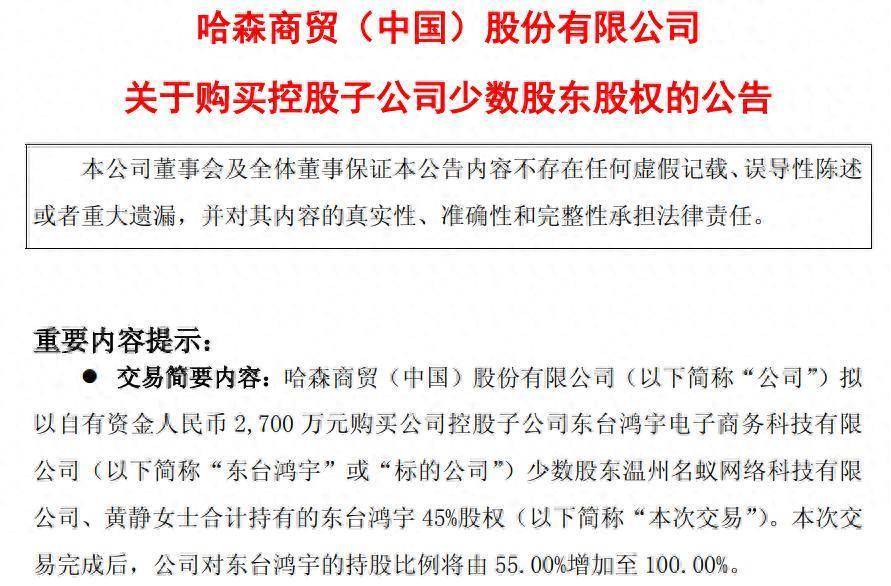 哈森股份(603958)10月22日晚间公告,公司拟以自有资金2700万元购买公司控股子公司东台鸿宇电子商务科技有限公司(以下简称“东台鸿宇”或“标的公司”)45%股权(以下简称“本次交易”)。本次交易完成后,公司对东台鸿宇的持股比例将由55%增加至100%。